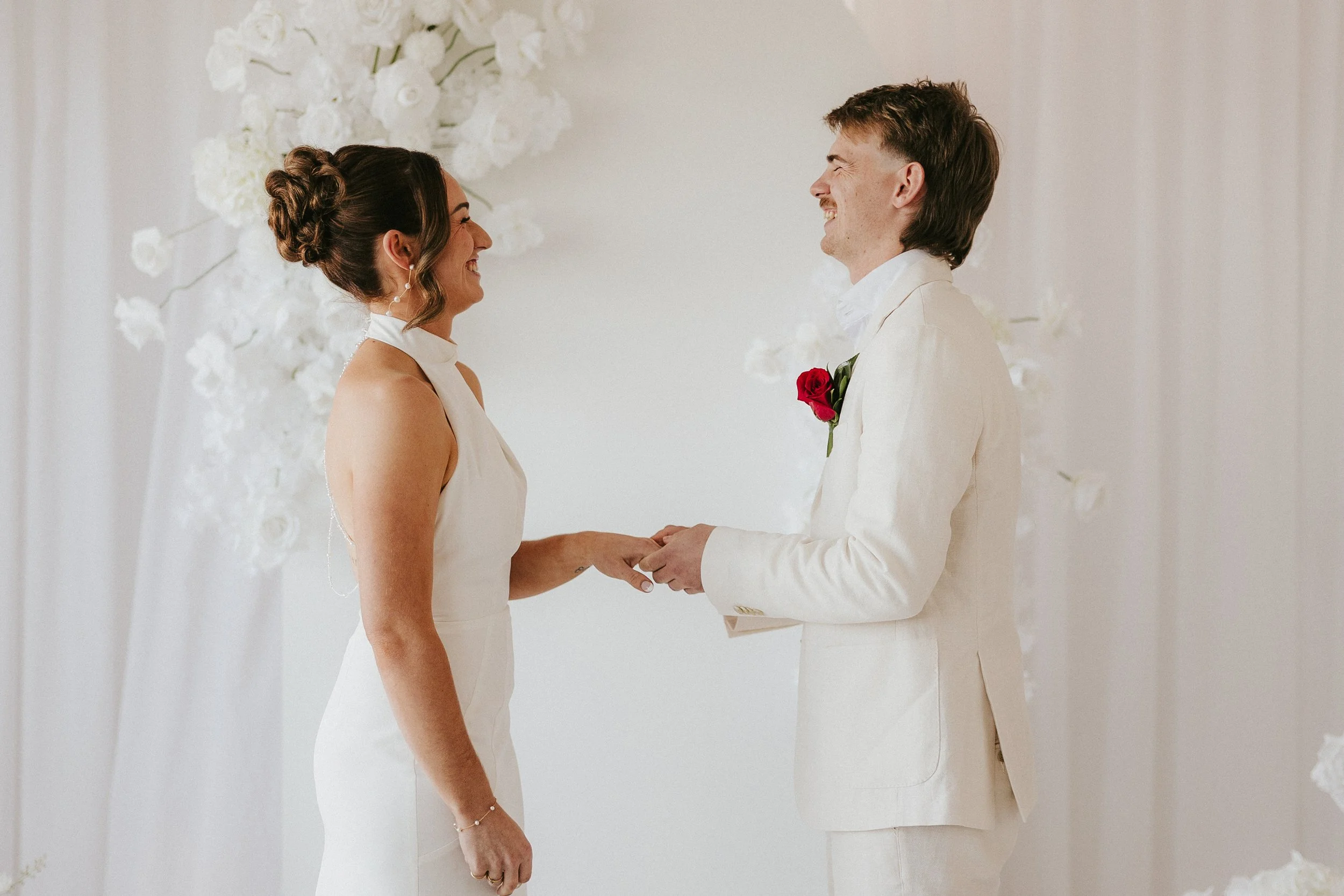 Includes a trusted celebrant to take care of your legal ceremony, and our signature All Dressed in White faux floral styling.$2849